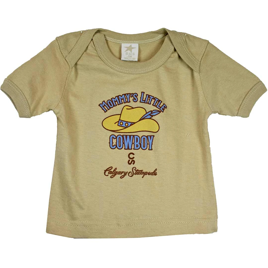 Custom made for the Calgary Stampede, this t-shirt features short sleeves, crew neck and a Calgary Stampede “Mommy’s little cowboy” graphic.