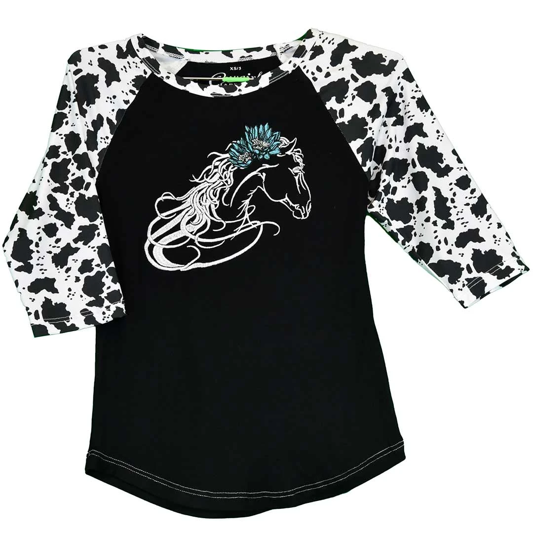 From Cowgirl Hardware, this girl’s 3/4 sleeve t-shirt features a horse with flowers in its hair design embroidery and contrasting cow print sleeves.
