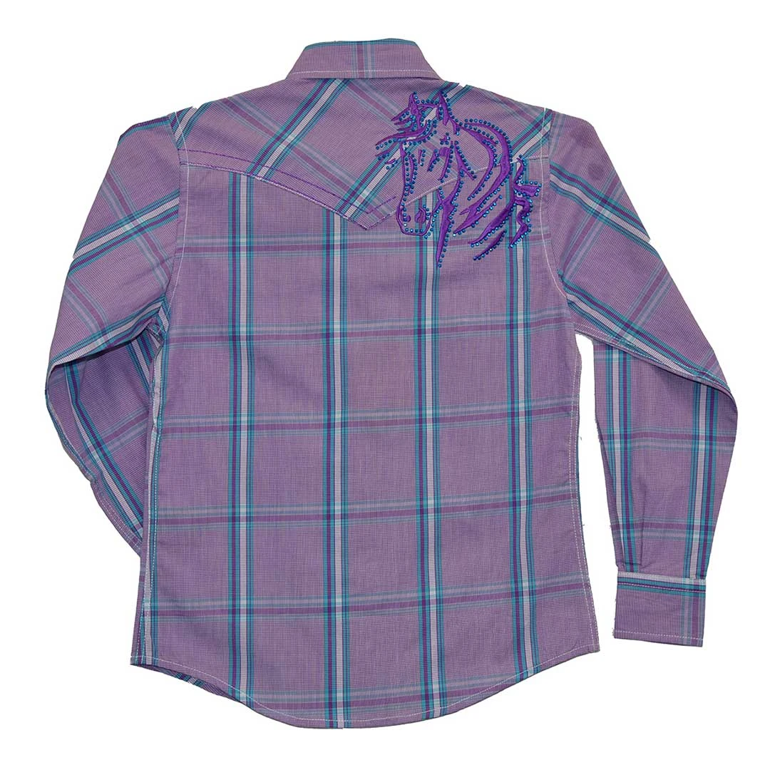 From Cowgirl Hardware, this lilac and turquoise plaid shirt features an embroidered horse detail with crystal embellishments on the back yoke, 1 point front and back yokes and a snap closure.