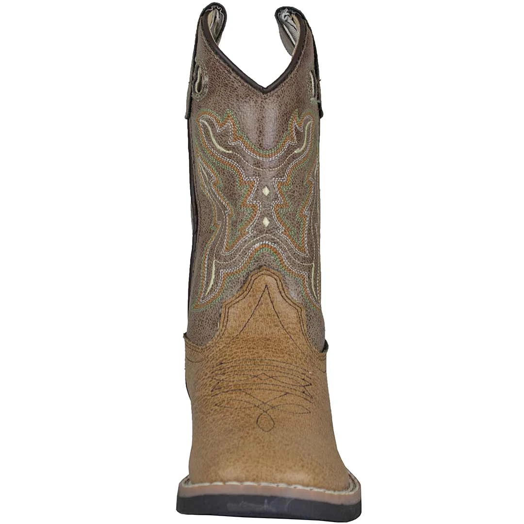 These Old West kids all over leatherette boots have a vintage tan foot and brown crackle shaft with fancy 2-row stitching. They have a broad square toe and flexible outsole.