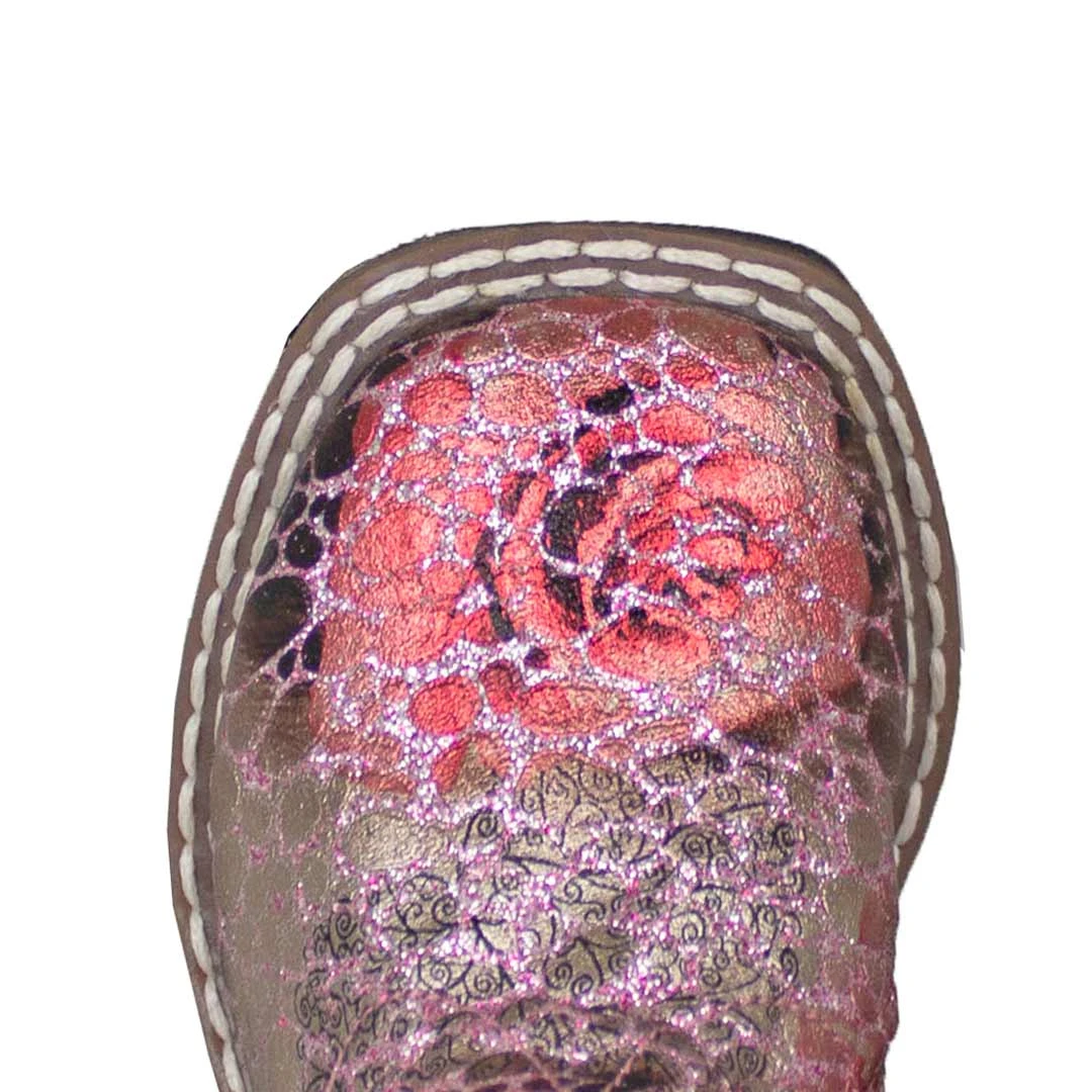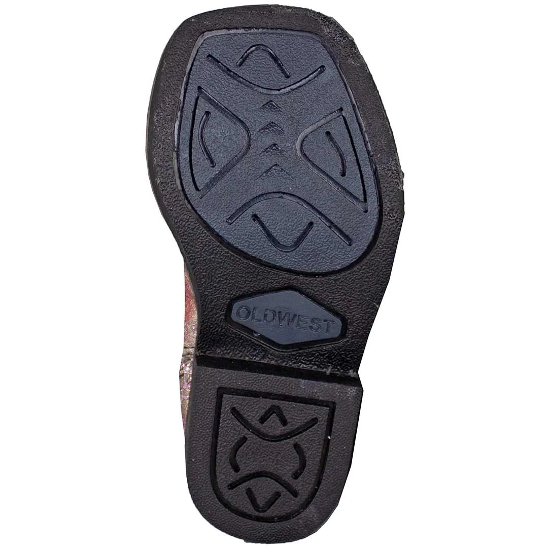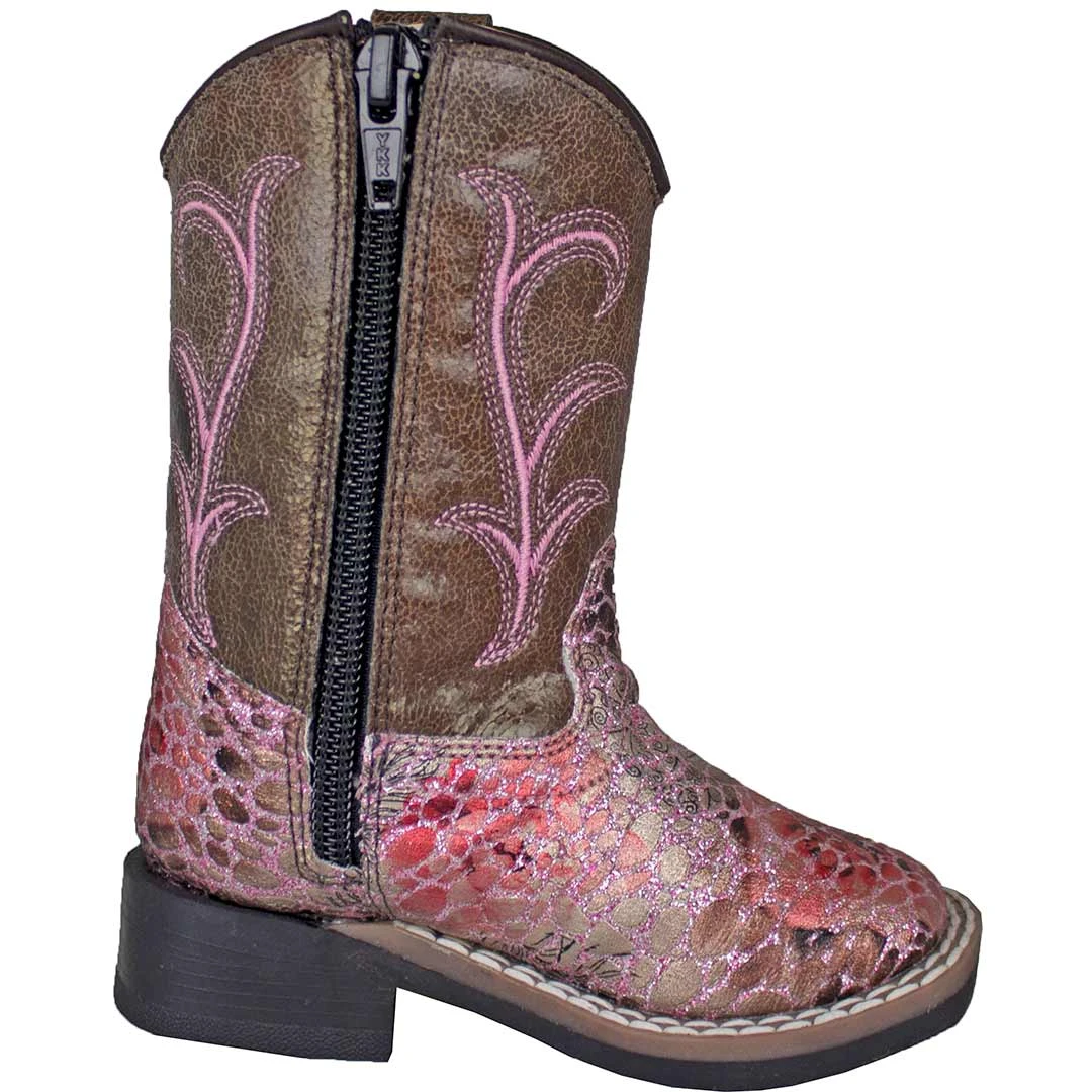 These Old West toddler girls’ cowgirl boots have a metallic croc pattern foot, a broad square toe, flexible outsole and a side zipper for easy on and off.