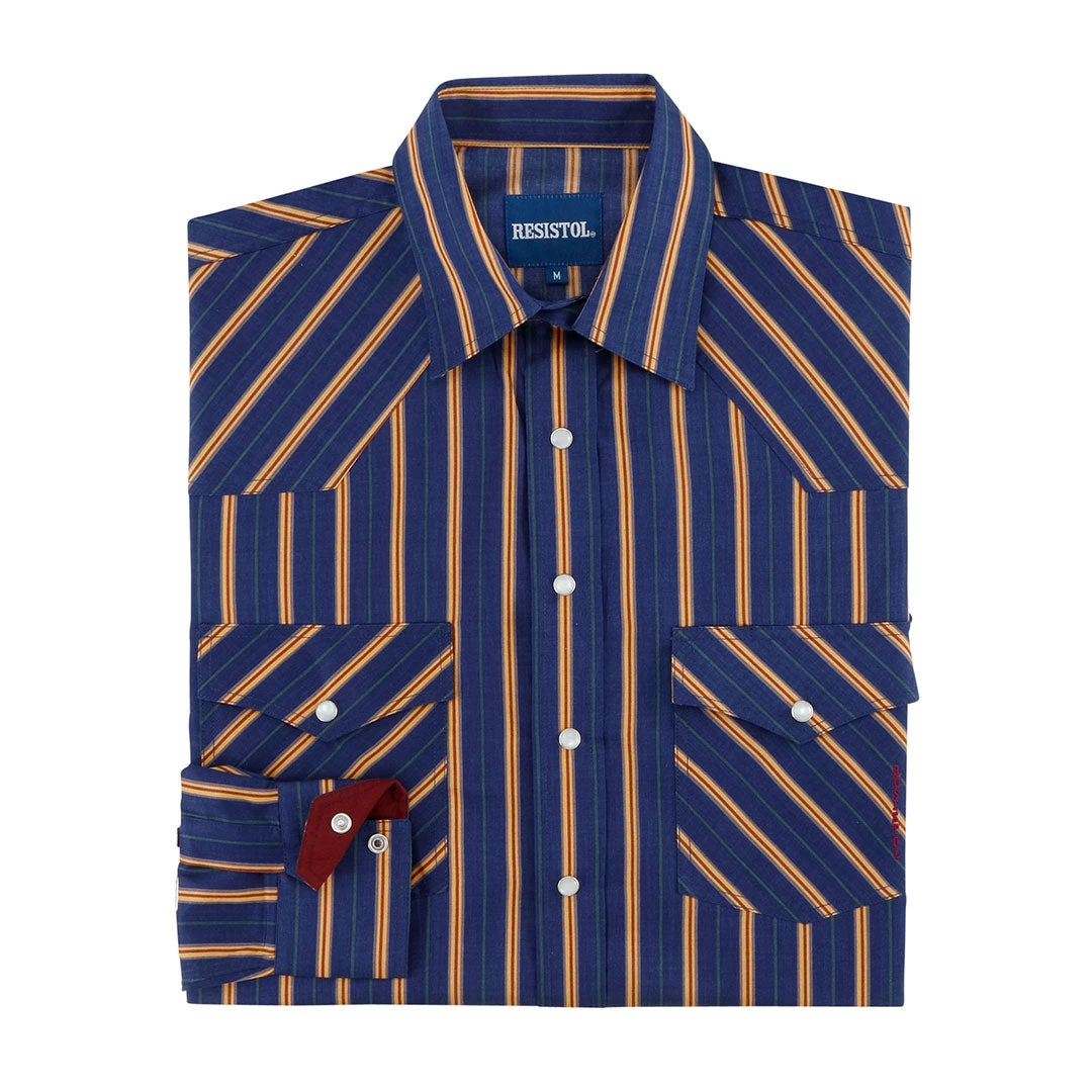 You can’t go wrong with the quality from Resistol Apparel. This boy’s western shirt has a blue and gold stripe pattern with classic western features.