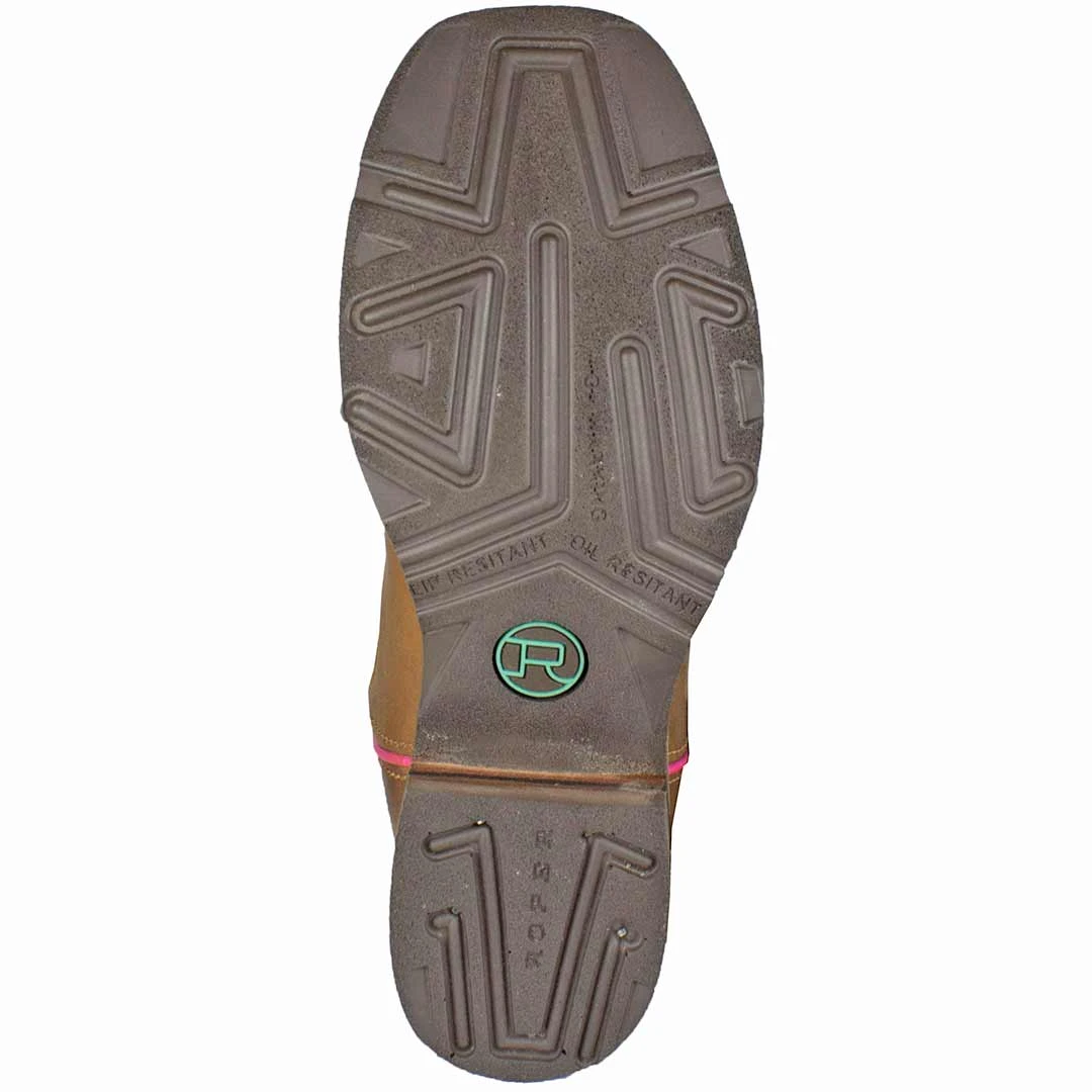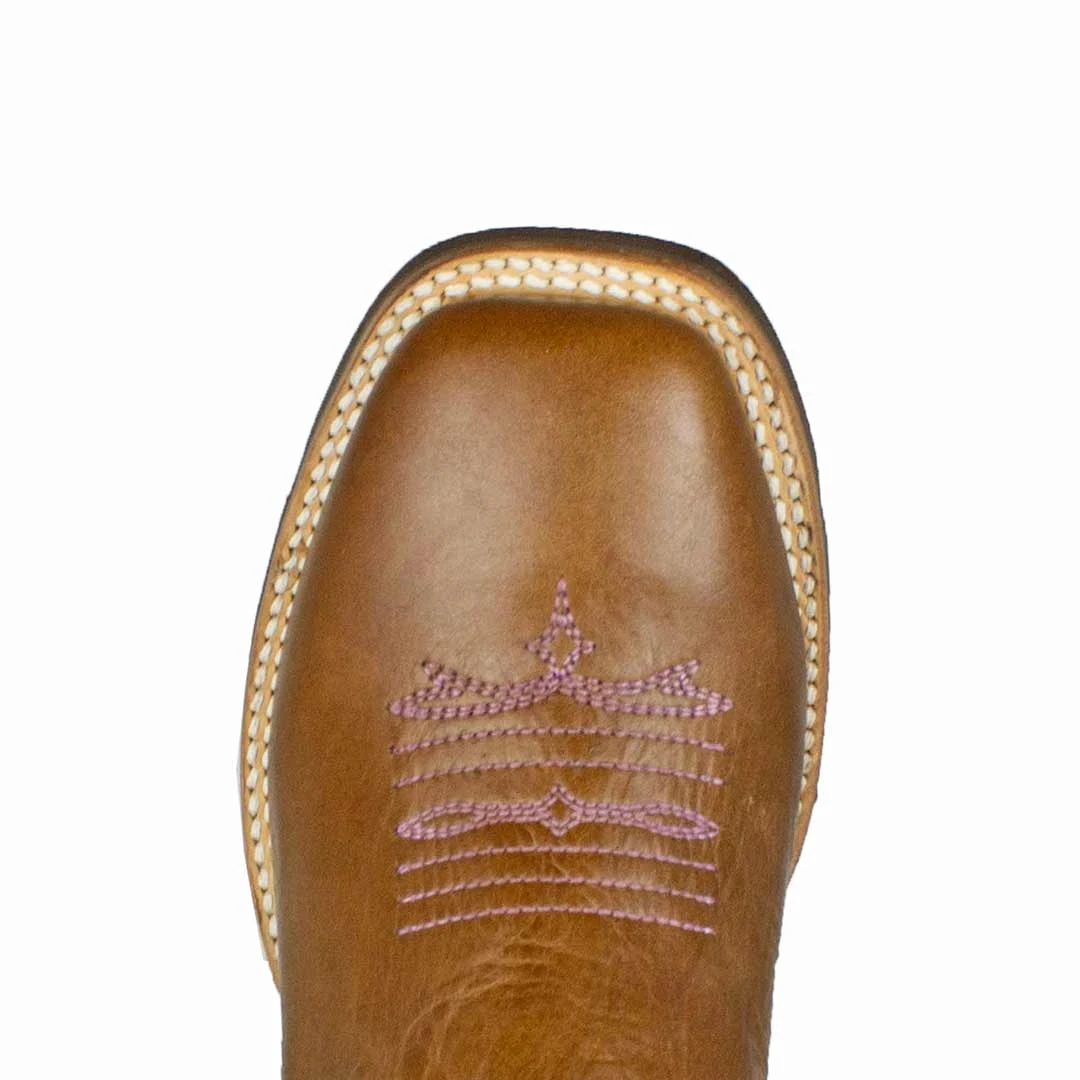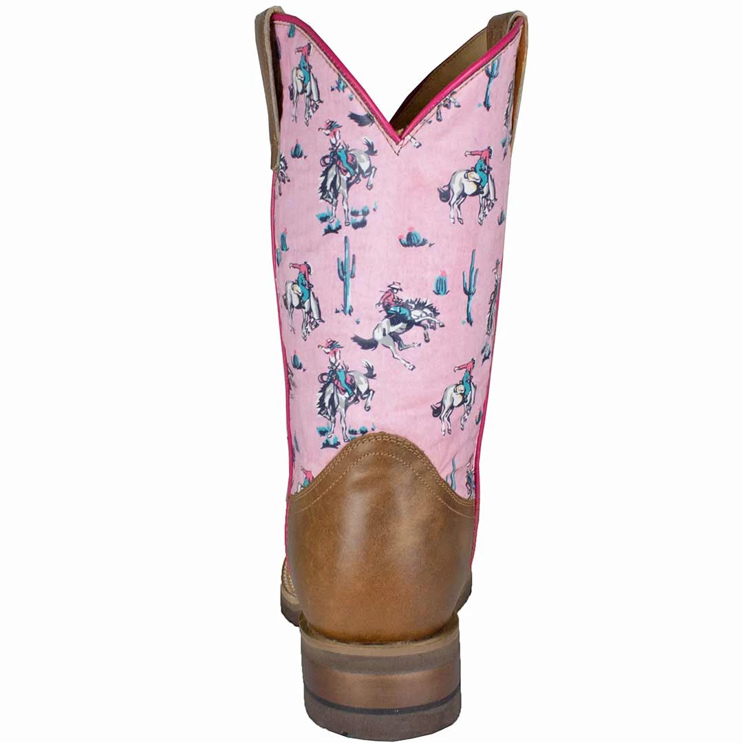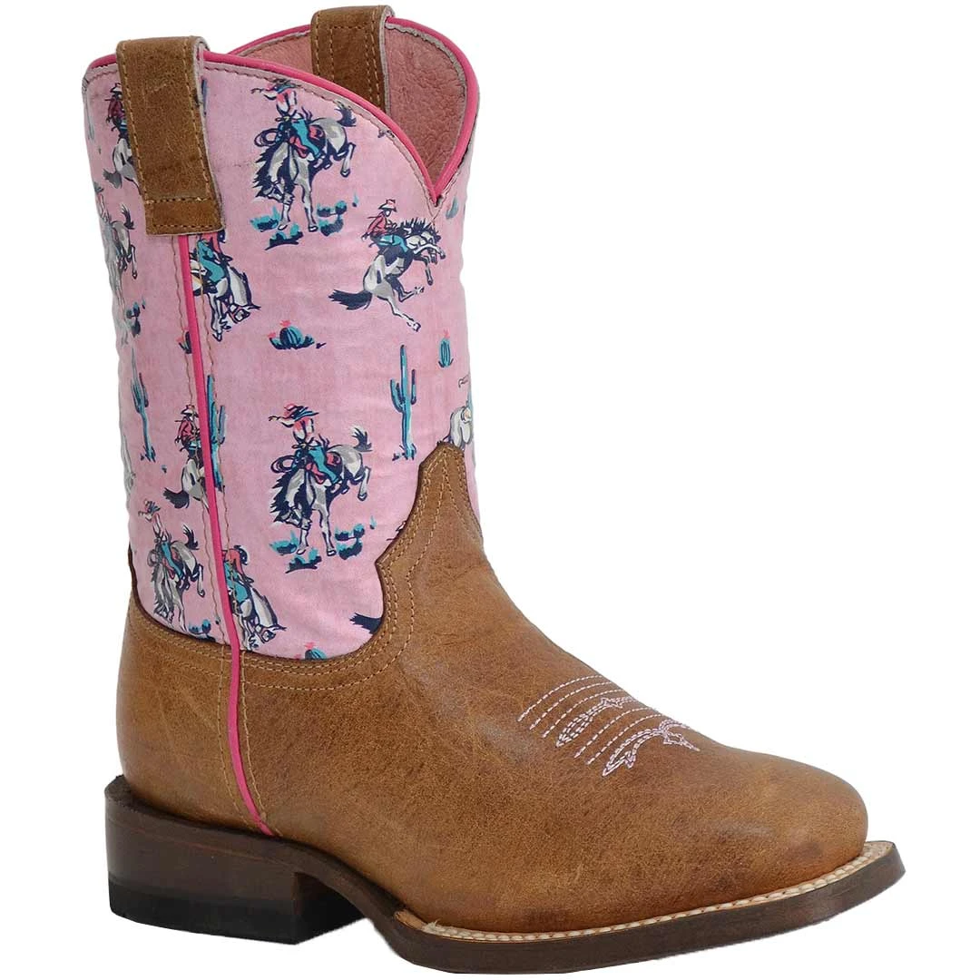 This authentic girl’s Roper cowgirl boot features a cowgirl print shaft and brown vamp and pink piping accents.