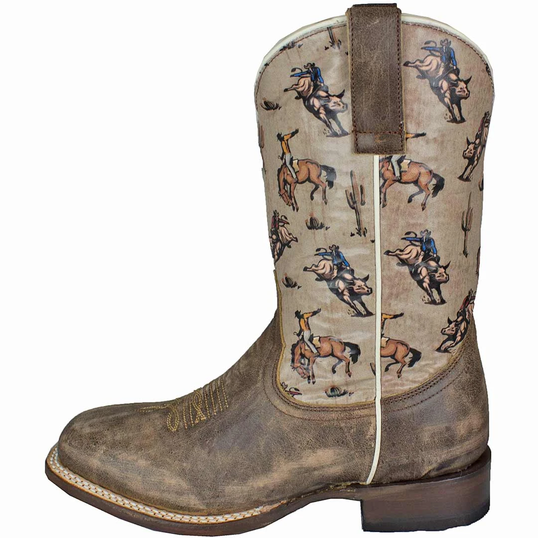 This authentic youth Roper cowboy boot features a buckin bronc print shaft, brown vamp and ivory piping accents.