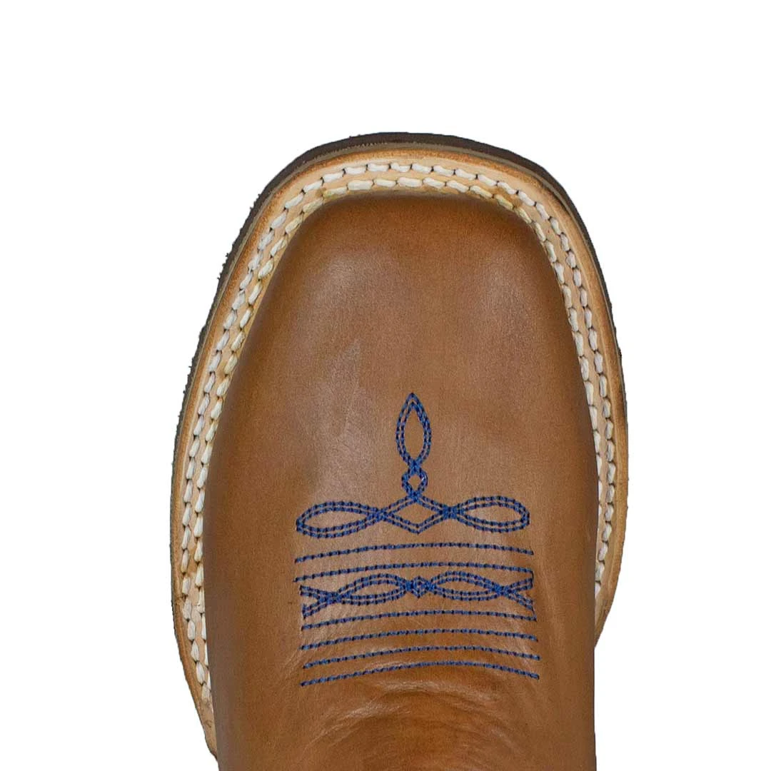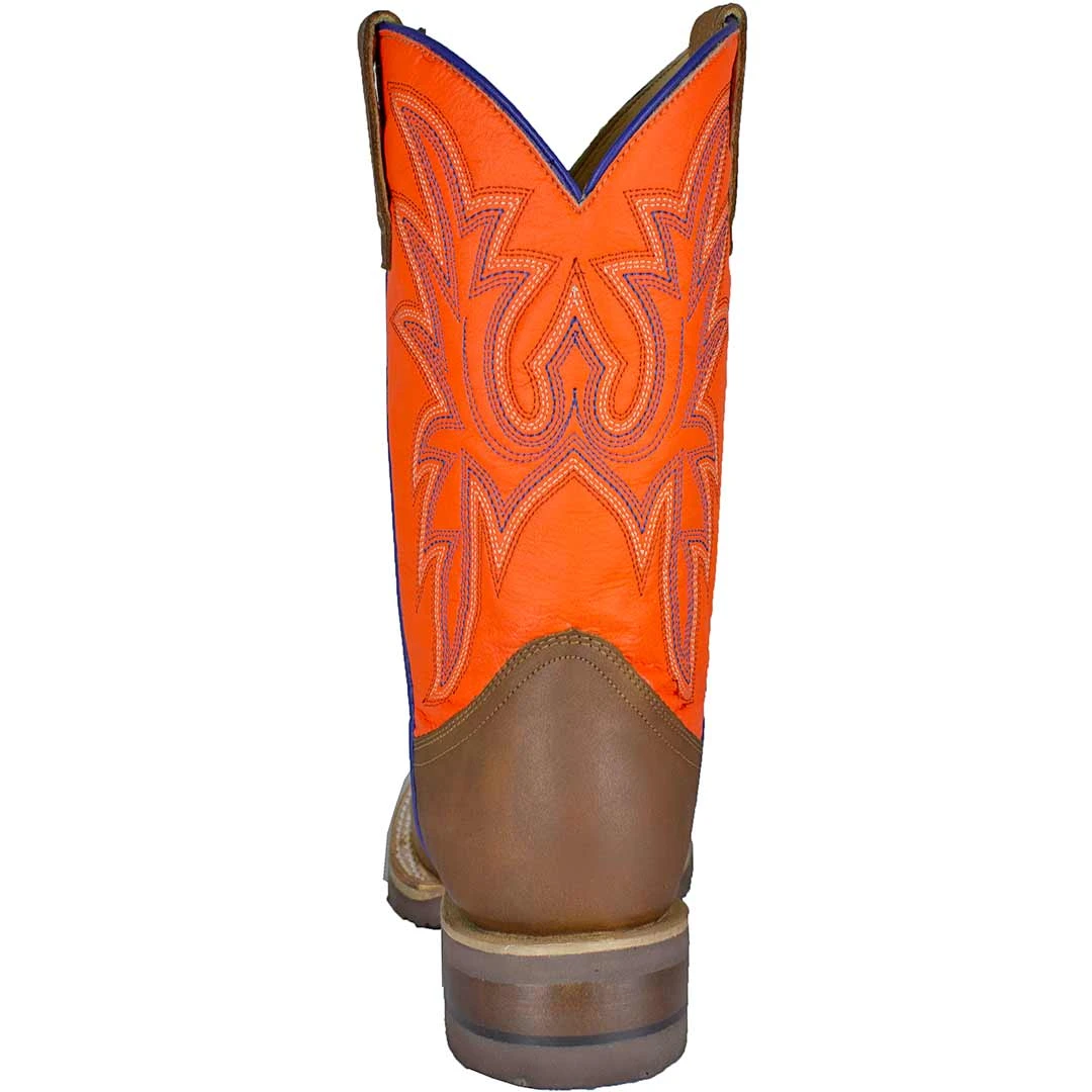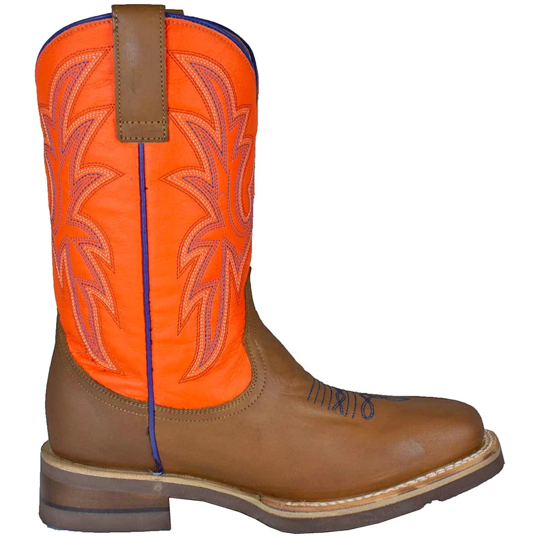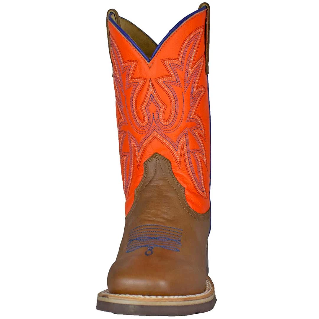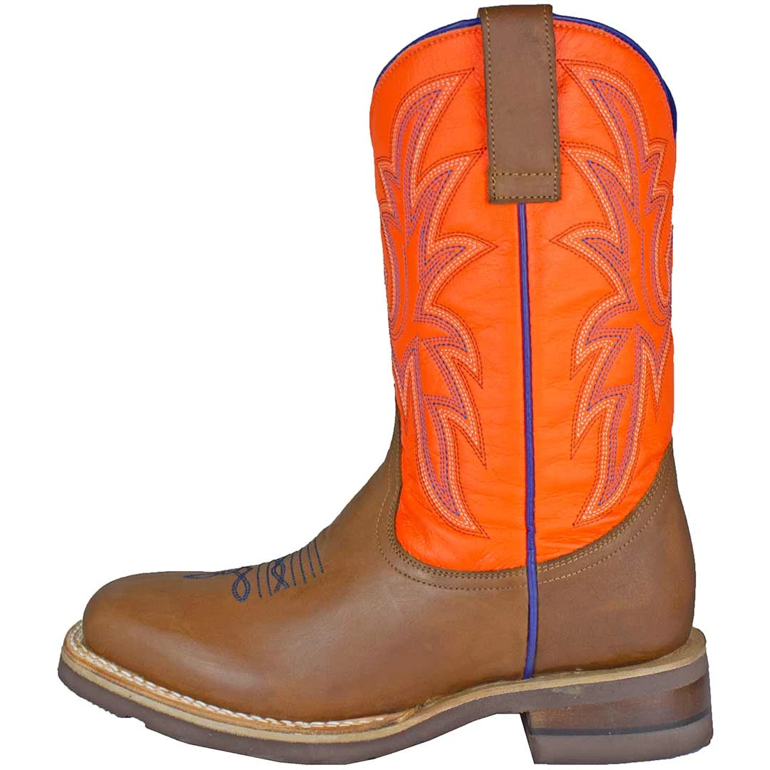 This authentic kids’ Roper cowboy boot features an orange shaft and brown vamp, with 7 row classic stitching and blue piping accents.